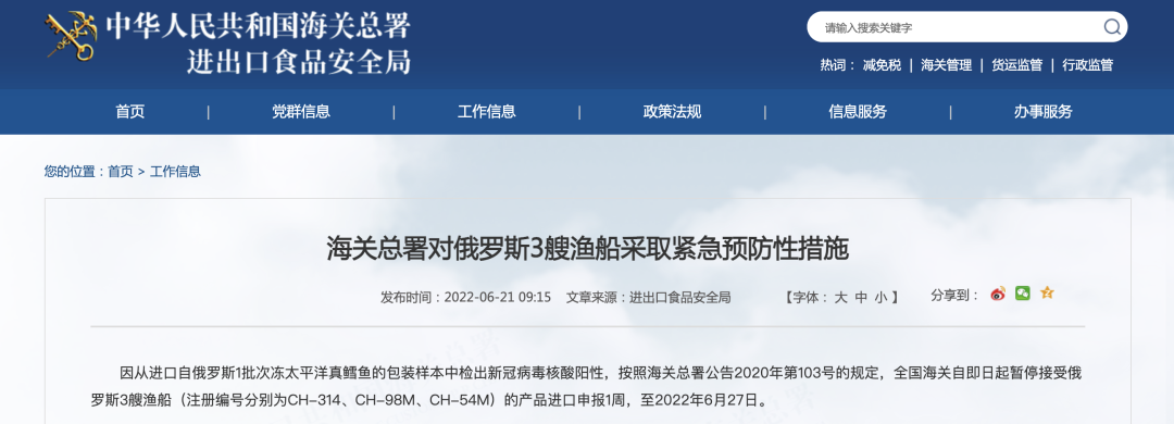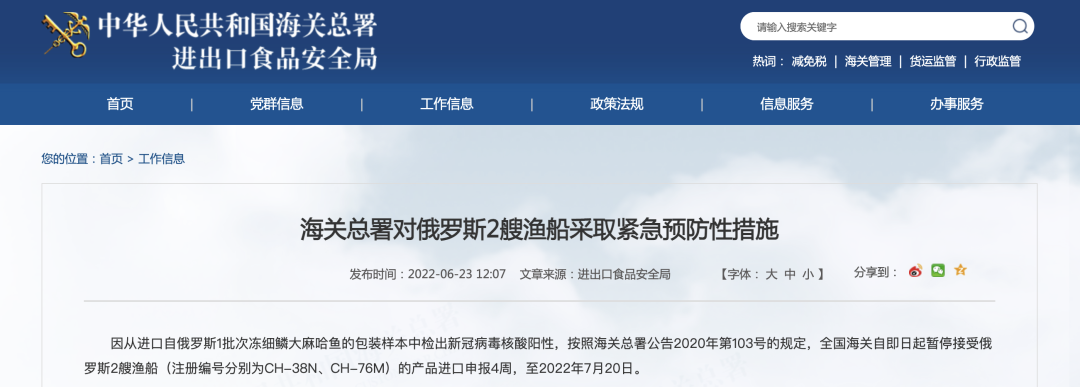 因从进口自俄罗斯1批次冻细鳞大麻哈鱼的包装样本中检出新冠病毒核酸阳性,按照海关总署公告2020年第103号的规定,全国海关自即日起暂停接受俄罗斯2艘渔船(注册编号分别为CH-38N、СН-76M)的产品进口申报4周,至2022年7月20日。