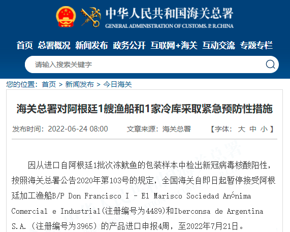 海关总署对阿根廷1艘渔船和1家冷库采取紧急预防性措施