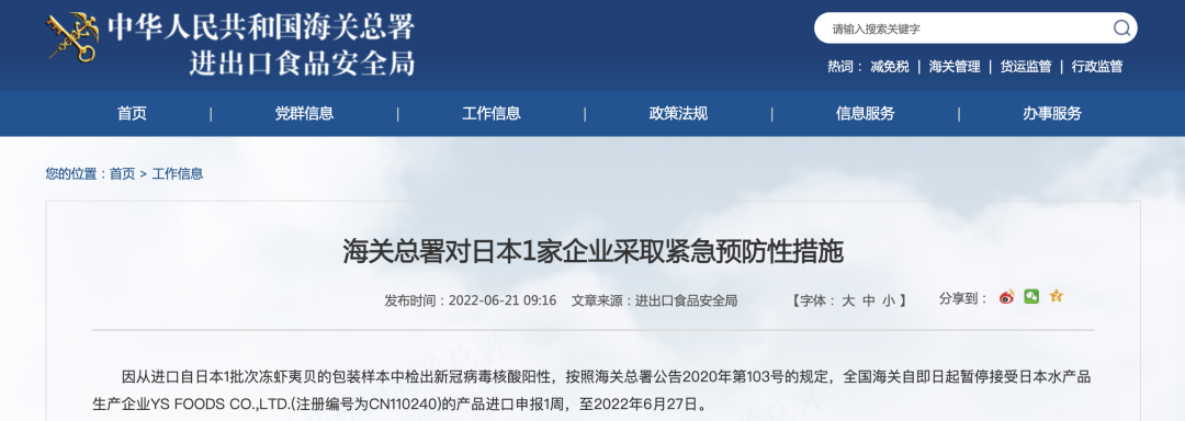 因从进口自日本1批次冻虾夷贝的包装样本中检出新冠病毒核酸阳性,按照海关总署公告2020年第103号的规定,全国海关自即日起暂停接受日本水产品生产企业YS FOODS CO.,LTD.(注册编号为CN110240)的产品进口申报1周,至2022年6月27日。