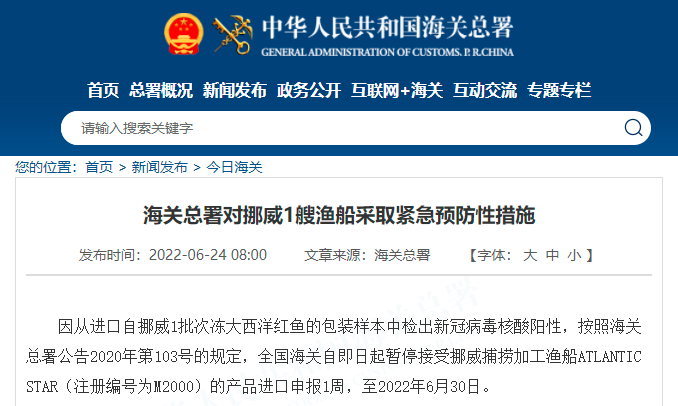因从进口自挪威1批次冻大西洋红鱼的包装样本中检出新冠病毒核酸阳性,按照海关总署公告2020年第103号的规定,全国海关自即日起暂停接受挪威捕捞加工渔船ATLANTIC STAR(注册编号为M2000)的产品进口申报1周,至2022年6月30日。