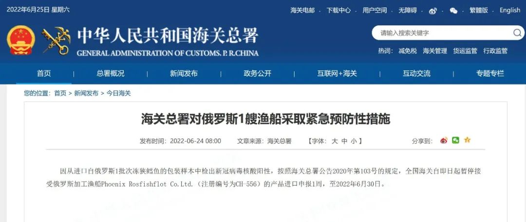 因从进口自俄罗斯1批次冻狭鳕鱼的包装样本中检出新冠病毒核酸阳性,按照海关总署公告2020年第103号的规定,全国海关自即日起暂停接受俄罗斯加工渔船Phoenix Rosfishflot Co.Ltd.(注册编号为CH-556)的产品进口申报1周,至2022年6月30日。