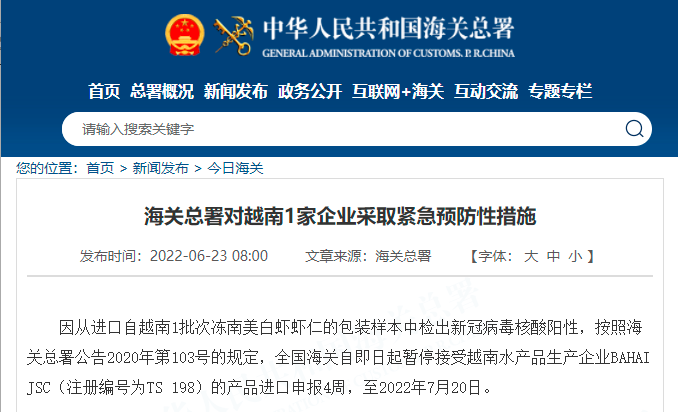 因从进口自越南1批次冻南美白虾虾仁的包装样本中检出新冠病毒核酸阳性,按照海关总署公告2020年第103号的规定,全国海关自即日起暂停接受越南水产品生产企业BAHAI JSC(注册编号为TS 198)的产品进口申报4周,至2022年7月20日。