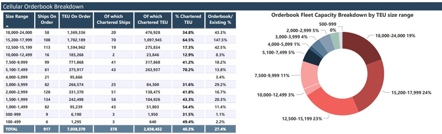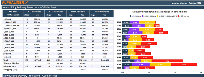其次,根据Alphaliner的数据,目前全球集装箱船手持订单917艘、704万TEU,占现有运营总运力的27.4%。预计2023年将交付343艘、约236万TEU的运力,2024年达到371艘、约290万TEU。仅从数据统计而言,这均是历史最高值。如果仔细分析这一波订单潮,我们可以发现: